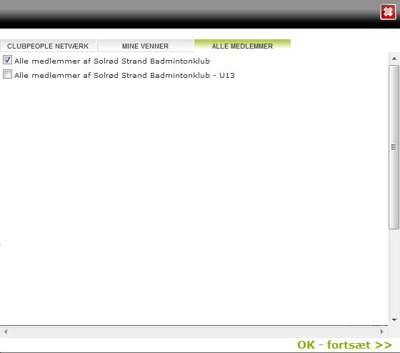 Her sættes hak i den forening, eller den gruppe, der skal have beskeden. Efter der er sat hak, klikkes på ”OK – fortsæt >>”.