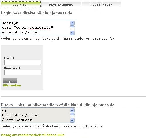 Ved at indsætte det første felt med kode på din hjemmeside, vil der vises en login box på hjemmesiden, således at medlemmer nemt kan logge ind på Danseren direkte.