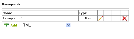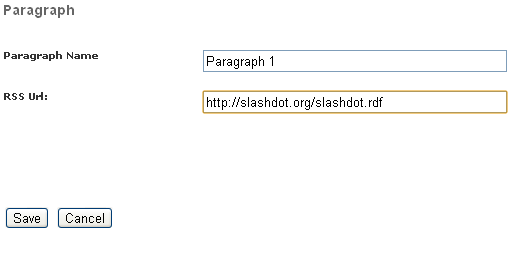 Here you can add the Paragraph name and the RSS Url and save the paragraph. After you save your RSS Url, your paragraph appears on the Page Contents pane like this:
